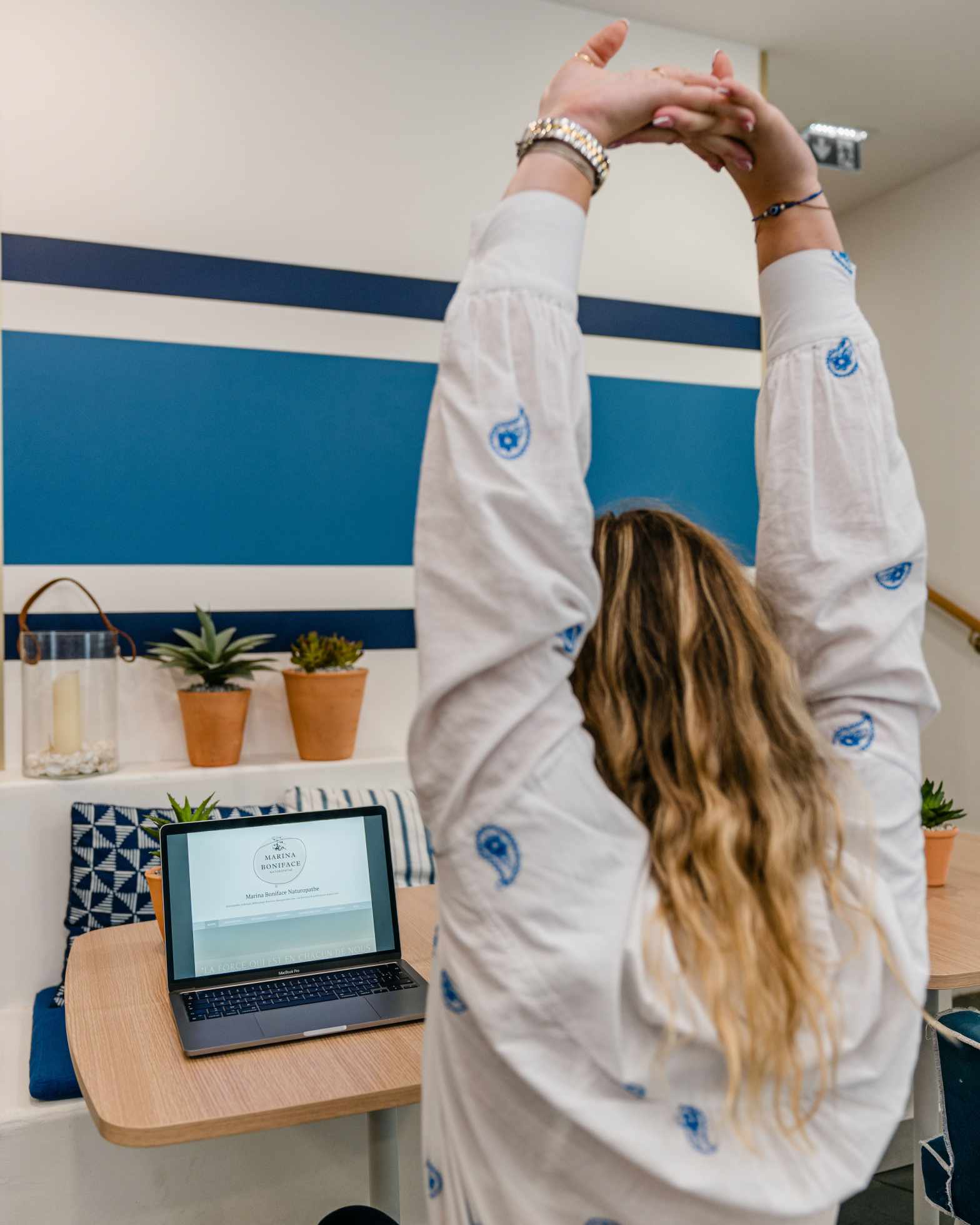 - Même chose mais en dirigeant les mains face à vous et en penchant la tête vers l’avant pour bien décontracter les trapèzes.